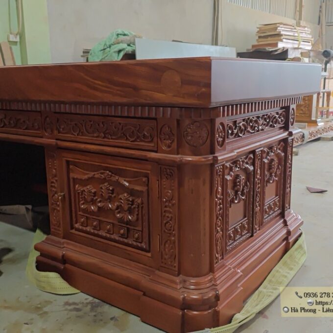 Bàn làm việc nguyên khối gỗ hương đá sẽ không thể thiếu trong phòng làm việc của một Doanh Nghiệp hay một cá nhân, nó sẽ tạo lên một không gian làm việc thật chuyên nghiệp sang trọng nhưng cũng vô cùng ấm áp với chất liệu gỗ tự nhiên 100%.