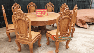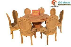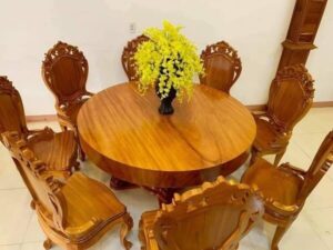 - Mặt bàn tròn nguyên khối thường làm bằng gỗ dổi, gỗ gõ đỏ, gõ bông lau, me tây… Bàn tròn nguyên tấm bao gồm mặt bàn, chân trụ và đôn ngồi. Với mức giá giao động 15 – 50 triệu tùy vào kích thước và chất liệu gỗ.