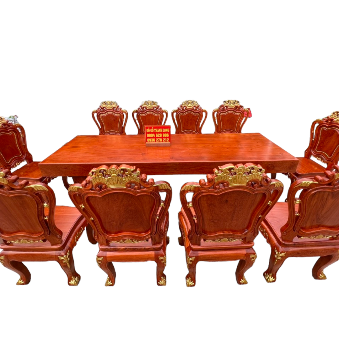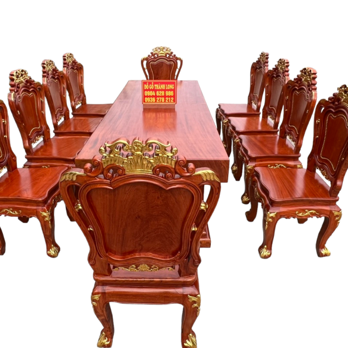 Bộ bàn ăn nguyên khối gỗ hương đá được kết hợp với 10 ghế ăn louis hoàng gia gỗ hương đá theo thông số kích thước yêu cầu của Anh Sơn tại Quảng Ninh. Thành Long rất cảm ơn anh đã tín nhiệm cơ sở đặt 3 đơn hàng lớn trong 2 năm liên tiếp. Bộ bàn ăn nguyên khối có ghế ăn được làm mặt tràn nguyên khối và đục họa tiết 2 mặt trước sau như nhau. Đặc biệt sở thích của Anh Sơn là những sản phẩm có phong cách dòng tân cổ điển được dát mạ vàng nổi bật như Bộ bàn ăn nguyên khối gỗ hương đá này đây.
